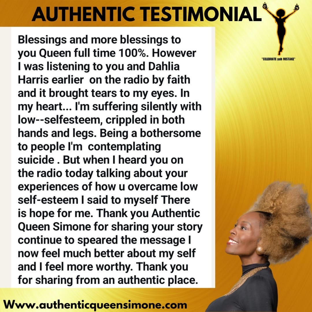 Order Now.Tired of shrinking, mask wearing, hiding and performing? this is your spiritual wakeup call. Give birth to yuh Authenticity is a soul- calling, memoir, self awakening book. Through lived experiences, hard-earned lessons and soul-stirring exercises Queen Simone helps readers to break free from Conditioning, perfectionism, people pleasing and victim mentality. This is not just a book to read , it's a movement to experience. With its transformational ,story-driven style and Queen Simone’s Authentic Jamaican voice , create a hybrid that is both empowering and practical.Review: