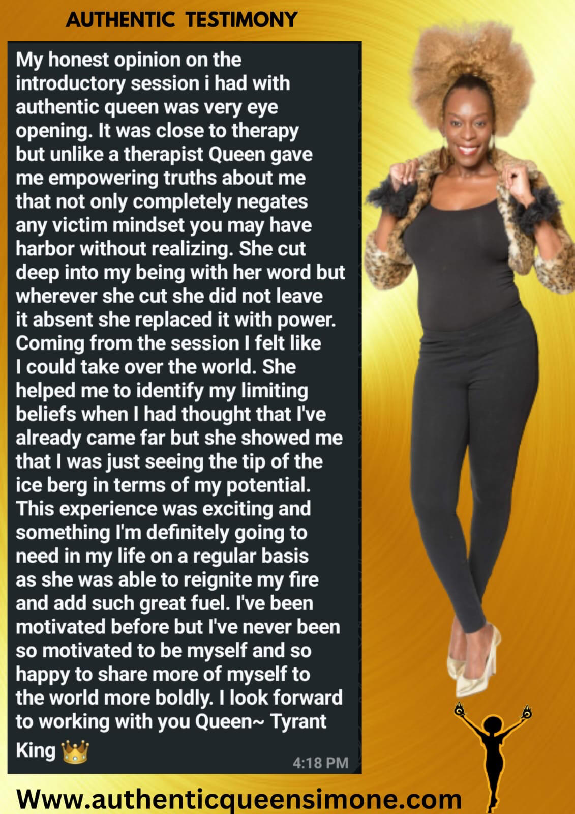 Mrs. Queen Simone Maghanza affectionately known as Authentic Queen Simone, Owner and Visionary Leader for AQS Services , Founder and creative director of the internationally recognized LoveUnuhSelf Initiative is an authentic spiritual speaker, inna self-confidence coach, mother and wife who inspires others with her journey of self-discovery. Growing up in Allman Town, she faced societal pressures and hurtful comments about her dark skin, which led her to bleach her skin for acceptance. Her struggles with insecurity deepened after experiencing emotional abuse from her father in a period of homelessness, which led to depression and a nervous breakdown. She coped with partying, drinking, and smoking.