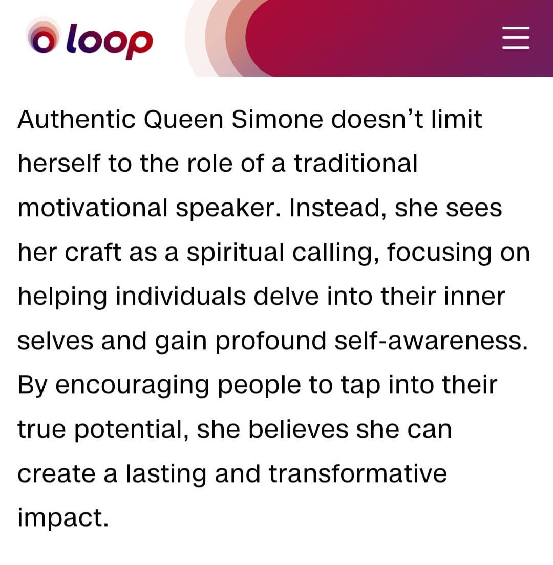 In 2005, at age 22, after a severe case of chickenpox, she had a moment of self-realization and vowed to stop seeking validation from others. She reclaimed her self-worth and stopped using bleaching cream. Now, she uses her experiences to help others focus on self-awareness, self-acceptance, and inna self confidence, encouraging them to embrace their authenticity from a place of healing. She has impacted over 12,000 lives and save seven from suicide and worked with 30+ organizations with a unique blend of spiritual wisdom, bold storytelling, lived experiences an unapologetic truth telling. Queen Simone is devoted to transforming communities,organizations, and schools through nation building— one healed soul at a time.Queen Simone was Recognized with the Caribbean Posh Icon Woman Awards in the Empowerment In action category