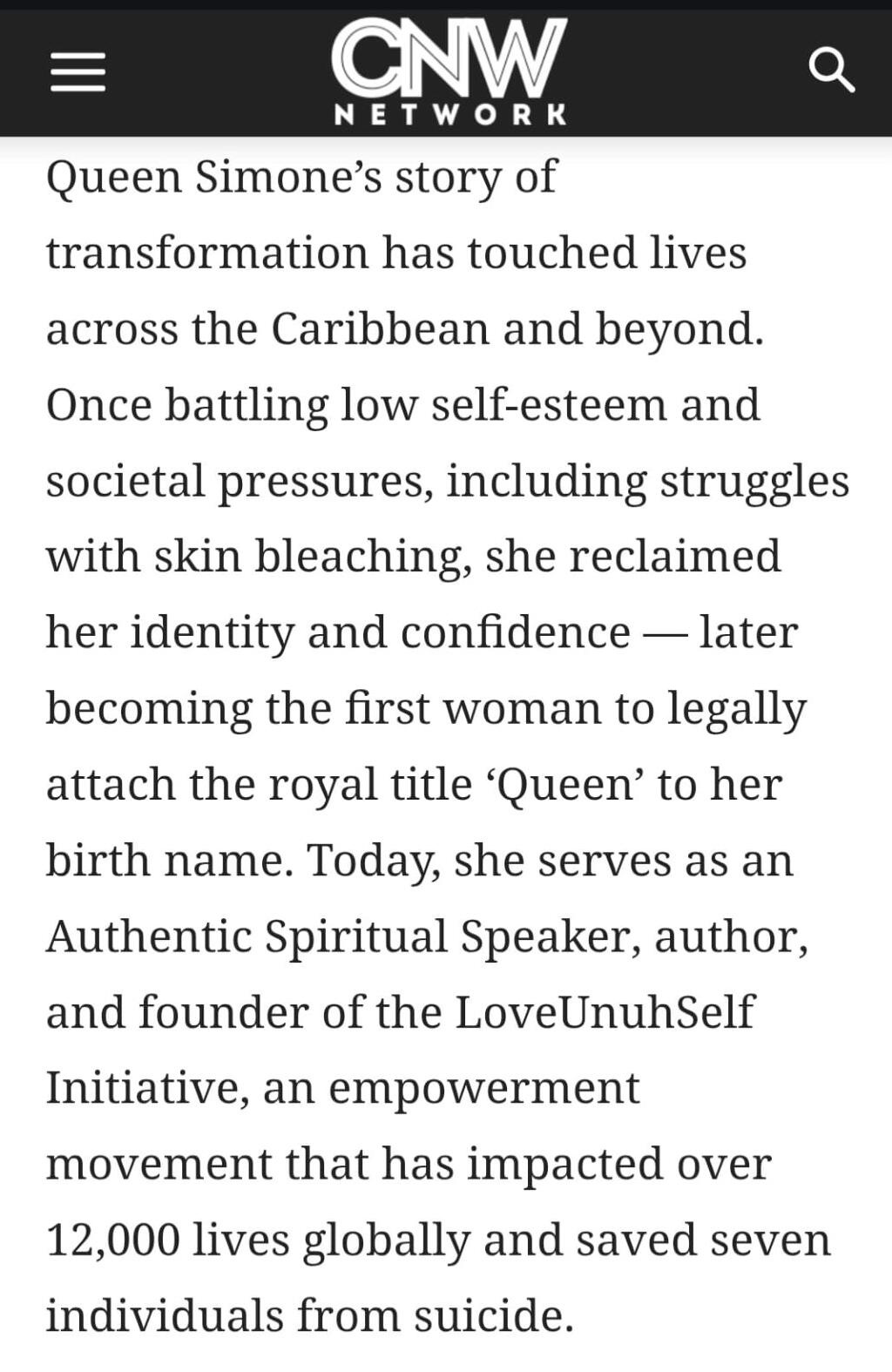 In 2005, at age 22, after a severe case of chickenpox, she had a moment of self-realization and vowed to stop seeking validation from others. She reclaimed her self-worth and stopped using bleaching cream. Now, she uses her experiences to help others focus on self-awareness, self-acceptance, and inna self confidence, encouraging them to embrace their authenticity from a place of healing. She has impacted over 12,000 lives and save seven from suicide and worked with 30+ organizations with a unique blend of spiritual wisdom, bold storytelling, lived experiences an unapologetic truth telling. Queen Simone is devoted to transforming communities,organizations, and schools through nation building— one healed soul at a time.Queen Simone was Recognized with the Caribbean Posh Icon Woman Awards in the Empowerment In action category